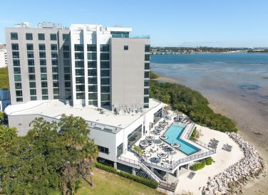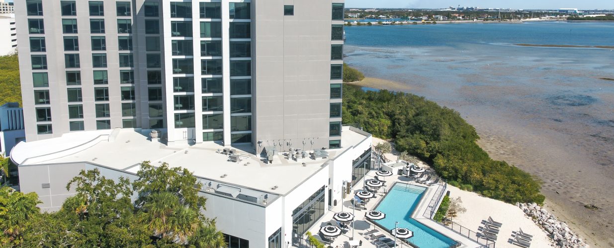 The property features a rooftop bar with panoramic views of the Tampa skyline, as well as beach access, a pool, ballroom, retail space, fitness center and on-site paddle boarding.